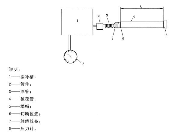 將規(guī)定長度的被覆管連接到緩沖槽上,緩沖槽容積大于或等于10L,將被覆管在緩沖槽一側(cè)管的被覆剝離,用膠帶等將被覆層與原管密封住,另外一端用端帽堵住,確認(rèn)配管整體的氣密保持在3kPa以上,從被覆管的末端算起,在規(guī)定長度的位置(即切斷位置),將測試軟管用剝離刀剝離約1cm寬度的被覆層,當(dāng)連接帶泄漏檢測功能的管件時,可不剝離被覆層。配管整體的內(nèi)壓在3kPa時,測量1min的壓力下降量,確認(rèn)其數(shù)值應(yīng)在150Pa以上為合格。