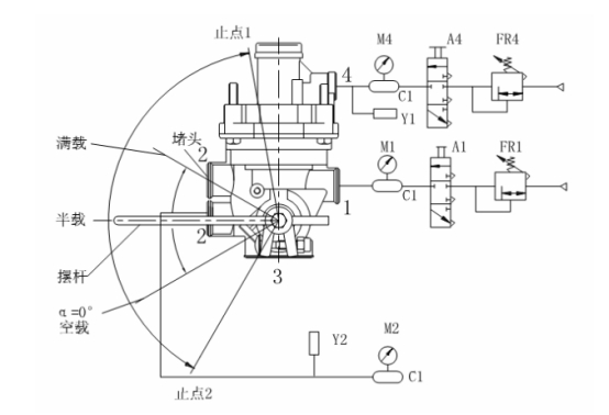 打開控制閥 A1、A4,從被測樣品進氣口、控制口充氣至 PE+50 0 。驅動操縱裝置使被測樣品擺桿從止點 2 緩慢轉動至止點 1,同時記錄出氣口輸出氣壓隨擺桿角位移變化的關系曲線。若采用非連續(xù)記錄方法, 擺桿角位移的測量間隔應不大于 2°。?