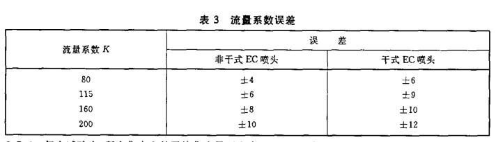按上述規(guī)定的方法進(jìn)行試驗(yàn),EC噴頭流量系數(shù)K的任一測(cè)量值和平均值均應(yīng)符合表3的規(guī)定。