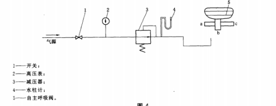 方法是:打開氣瓶開關(guān),調(diào)整減壓器,使輸出流量為30L/min,將測(cè)量連接件接插在自主呼吸閥a端,并使悶處于直立狀態(tài),記錄水柱計(jì)指示值。
