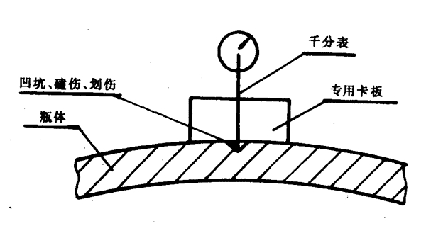 a)凹坑、磕傷、劃傷深度值以深處為準,測量用的專用量具如圖B2所示??ò宓男兔媲拾霃脚c鋼瓶外廓相吻合,千分表的針尖插入缺陷中測量其深度,針尖的楔角應(yīng)小于等于30°,半徑應(yīng)小于等于0.25mm。測量過程中要定期校核千分表的讀數(shù),以消除由于針尖磨損造成的誤差。