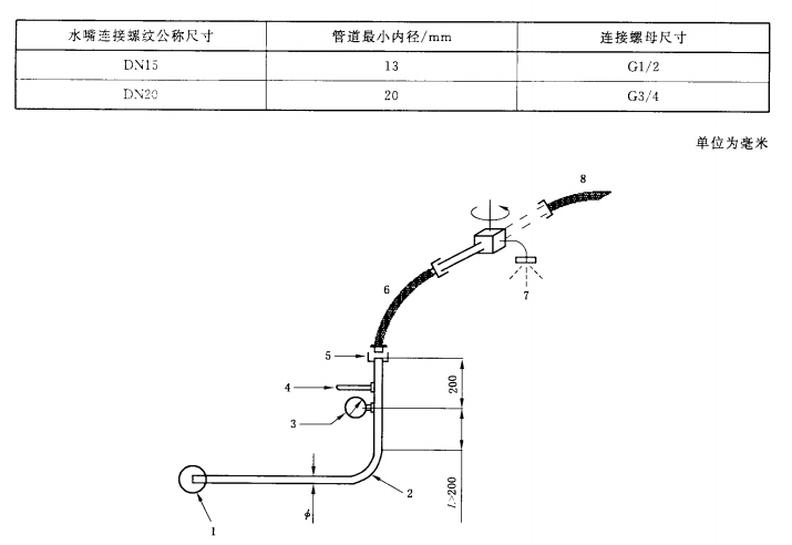 b)500mm長的柔性管道,小內(nèi)徑等于金屬管道,末帶有可連接水嘴的裝置